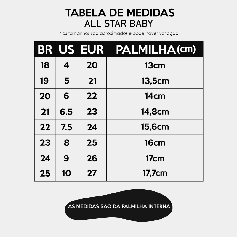 | Tamanho | 18, 19, 20, 21, 22, 23, 24, 25, 26, 27, 29 |