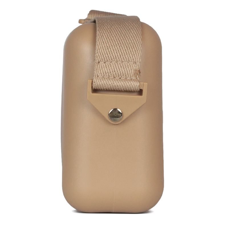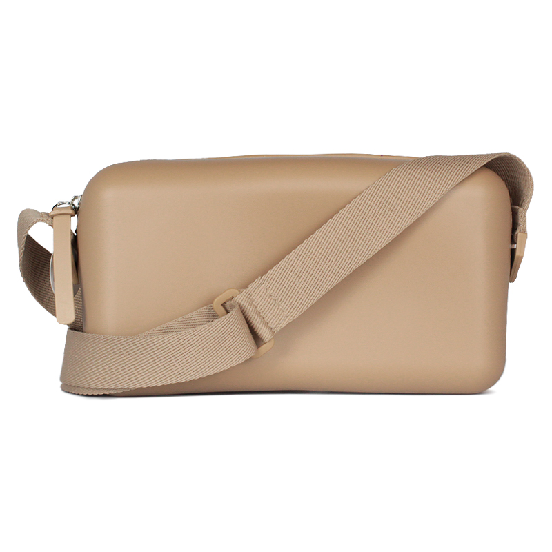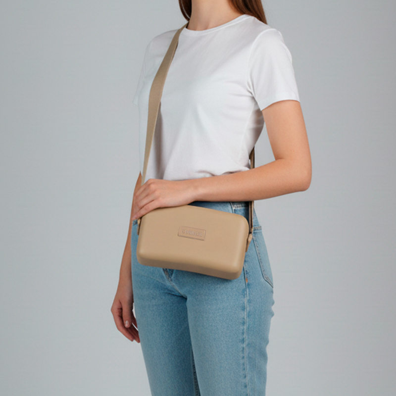 A Bolsa Bali entrega estética limpa e estrutura que protege o conteúdo. O corpo semirrígido tem toque emborrachado fosco (polímero moldado, resistente a respingos e fácil de limpar) com cantos arredondados que mantêm a forma. Fecha com zíper superior e traz alça de fita tecida regulável — leve no ombro ou crossbody. Por dentro, compartimento único sem divisórias para acomodar o essencial do dia. Medidas aproximadas: 21 cm (L) × 12 cm (A)
