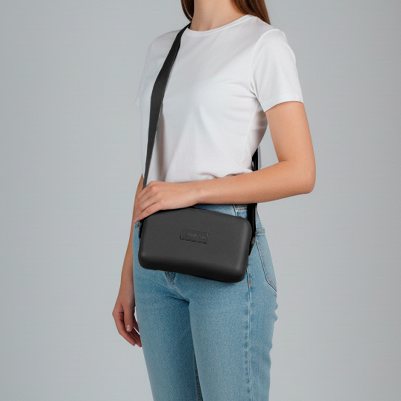 A Bolsa Bali entrega estética limpa e estrutura que protege o conteúdo. O corpo semirrígido tem toque emborrachado fosco (polímero moldado, resistente a respingos e fácil de limpar) com cantos arredondados que mantêm a forma. Fecha com zíper superior e traz alça de fita tecida regulável — leve no ombro ou crossbody. Por dentro, compartimento único sem divisórias para acomodar o essencial do dia. Medidas aproximadas: 21 cm (L) × 12 cm (A)