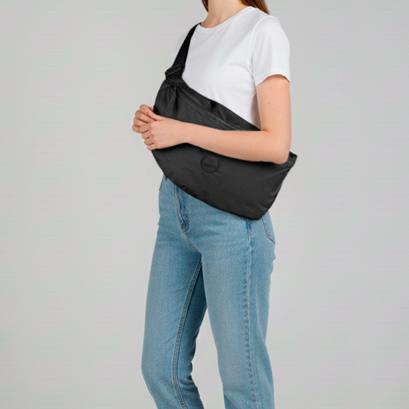 A Bolsa Pochetão é uma pochete ampliada feita em nylon/poliéster. Tem fechamento superior em zíper, bolsos internos para separar pequenos objetos e alça regulável para uso no peito, nas costas ou na cintura. Corpo maleável que acomoda volume sem rigidez. TAMANHO APROXIMADO: 40cm L × 20 cm A