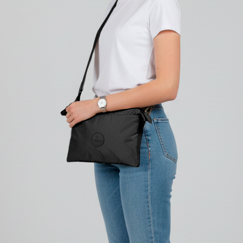 A Bolsa Rira é uma crossbody compacta (22,5 × 16 cm) feita em nylon poliéster: leve, resistente e fácil de limpar. Traz fechamento superior em zíper para o compartimento principal e bolso frontal com zíper para acesso rápido. A alça regulável permite ajustar a altura para uso no ombro ou transversal, com mosquetões metálicos para engate/remoção.