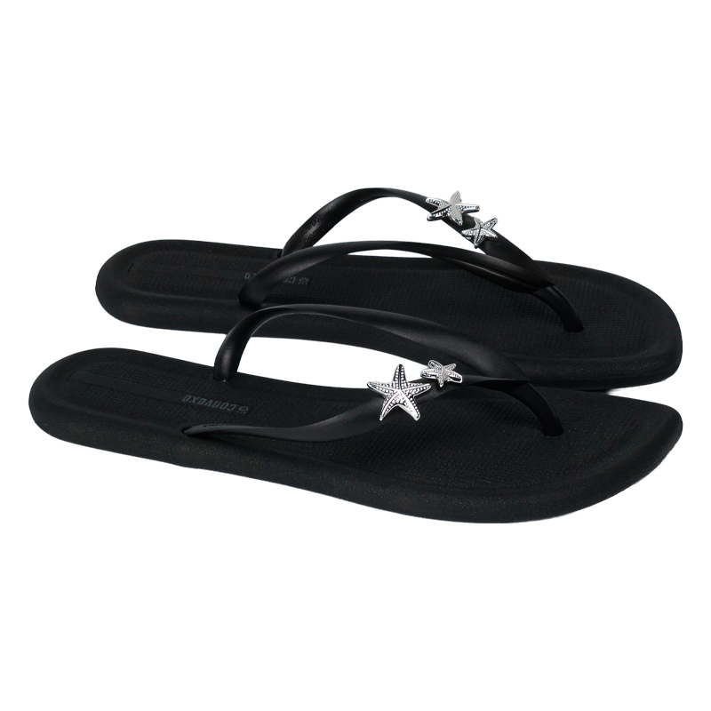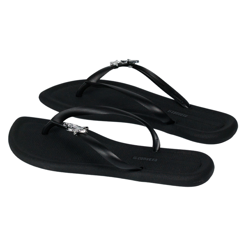O Chinelo Puff Ocean Preto da Convexo traz o básico com um toque de brilho. Em borracha macia com efeito “puff”, ele abraça o pé com conforto, enquanto as tiras finas em material sintético leve valorizam o peito do pé. As aplicações metálicas em formato de estrelas-do-mar dão o clima de praia de um jeito discreto e moderno. Com solado emborrachado com textura para mais aderência, é aquele chinelo fácil de combinar com biquíni, vestidos ou shorts, perfeito para usar da areia à cidade.