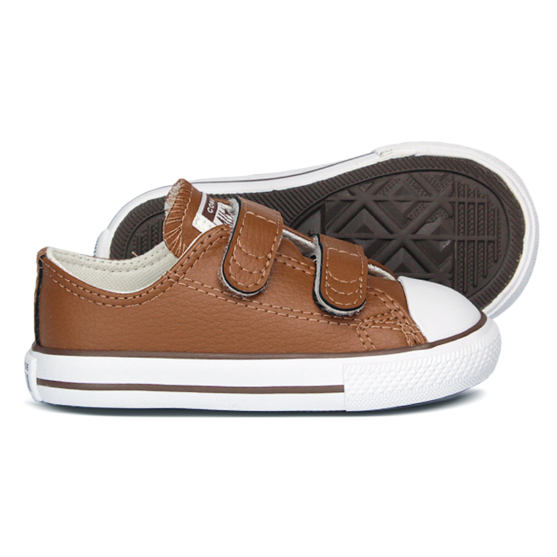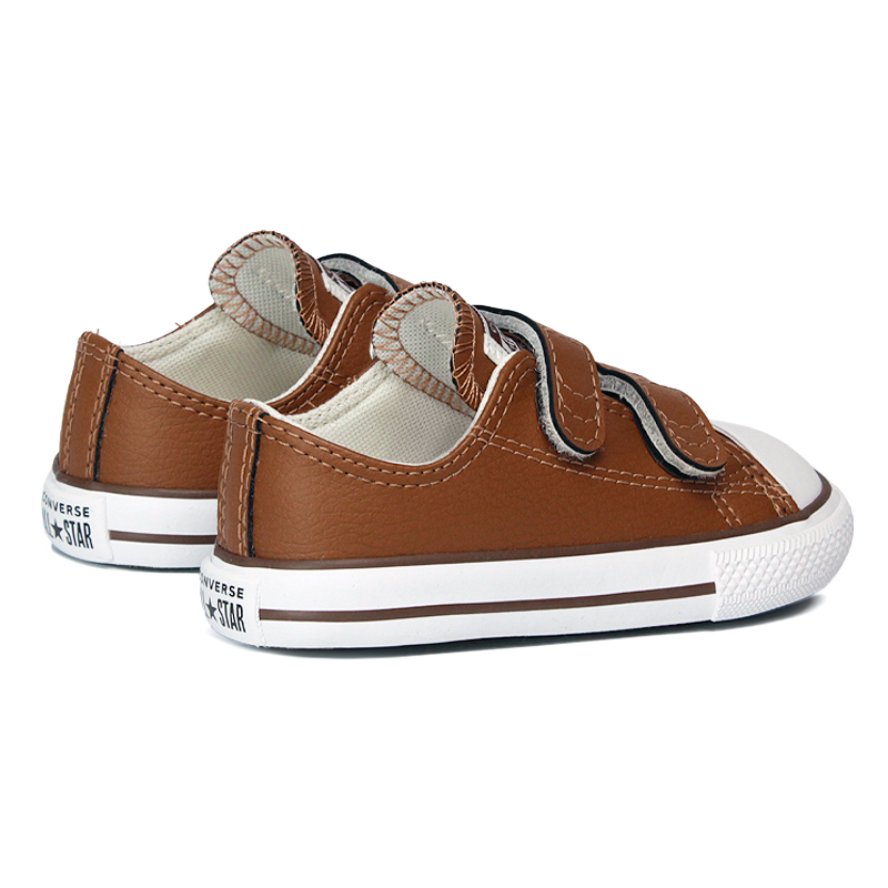 O Chuck Taylor All Star Baby 2V Marrom combina o visual tradicional dos Chucks em uma nova versão para os pequenos. Com cabedal em material sintético resistente e costuras que acompanham a tonalidade do modelo, oferece um acabamento harmonioso e moderno. O design de cano baixo traz versatilidade, enquanto os dois velcros na parte superior garantem ajuste fácil e seguro. A palmilha em EVA proporciona conforto leve para o dia todo, complementado pelo clássico solado em padrão diamante, símbolo da herança Converse.