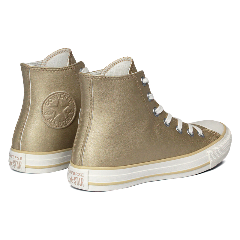 O Chuck Taylor All Star Hi Ouro Claro traz o clássico design de cano alto em uma versão moderna e sofisticada. Confeccionado em material sintético metalizado, o modelo combina estilo urbano com um toque de brilho, ideal para quem busca autenticidade e personalidade no visual. O tênis conta com cadarço de algodão que garante firmeza no ajuste e conforto no calce, além de solado emborrachado que oferece aderência e durabilidade para o dia a dia. O tradicional logo da marca aparece na lingueta e no calcanhar, reforçando a identidade icônica da Converse.