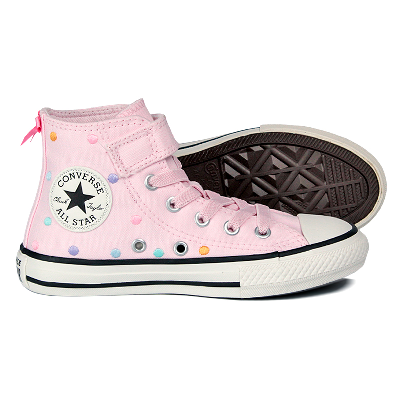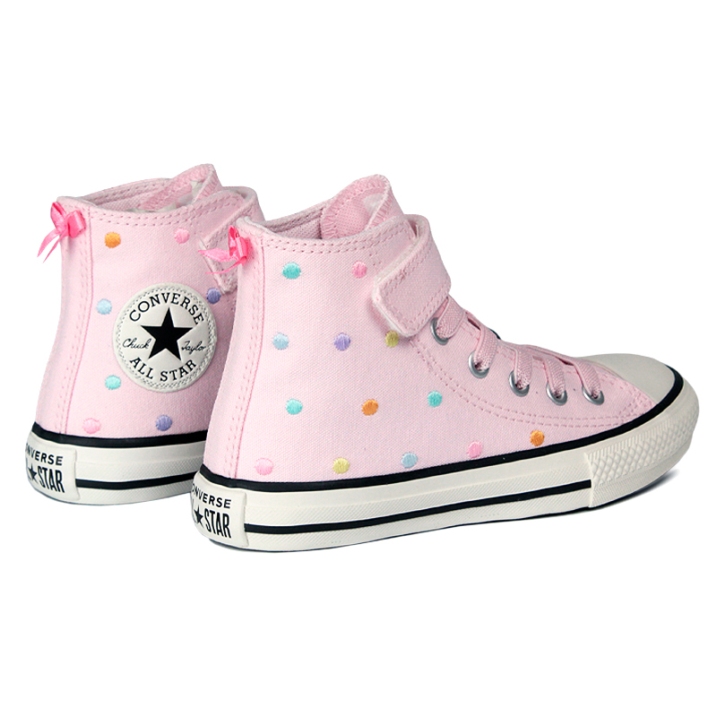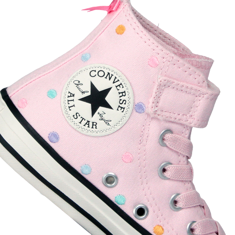 O Chuck Taylor All Star Kids 1V Polka Dots Rosa traz a alegria das bolinhas bordadas em um design que celebra a imaginação infantil. A lona resistente mantém o visual clássico dos Chucks, enquanto o amortecimento em EVA proporciona conforto em cada passo. A alça ajustável facilita na hora de calçar e retirar, garantindo praticidade no dia a dia. O patch icônico Chuck Taylor no tornozelo e a etiqueta All Star reforçam a herança Converse com um toque divertido.