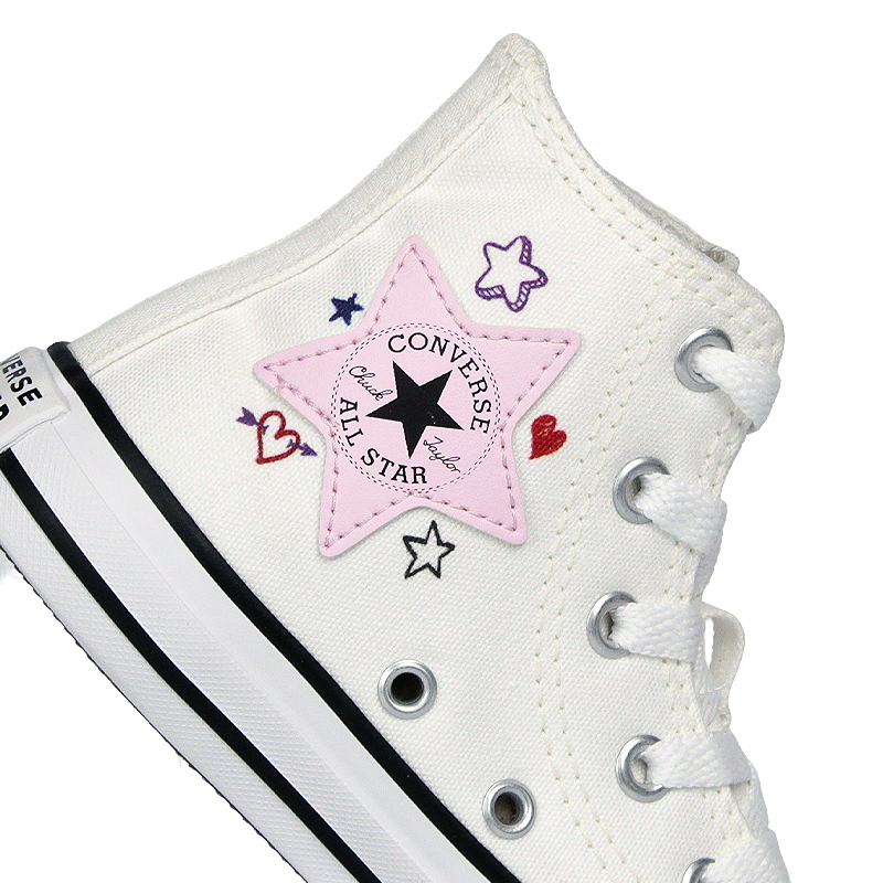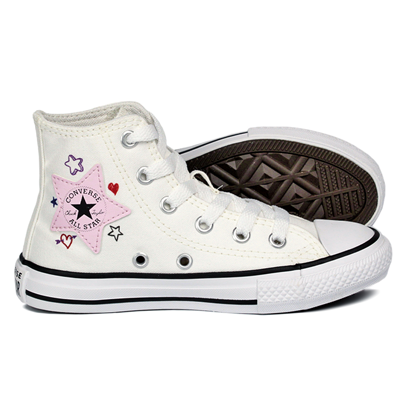O Chuck Taylor All Star Kids Hi Essentials Branco apresenta estampa exclusiva de estrelas em estilo artesanal, logo lateral em formato de estrela e forro com espaço para adicionar o nome. O modelo conta ainda com cadarço de poliéster, que garante ajuste prático e resistente, mantendo o visual clássico da Converse em uma versão pensada para os pequenos.