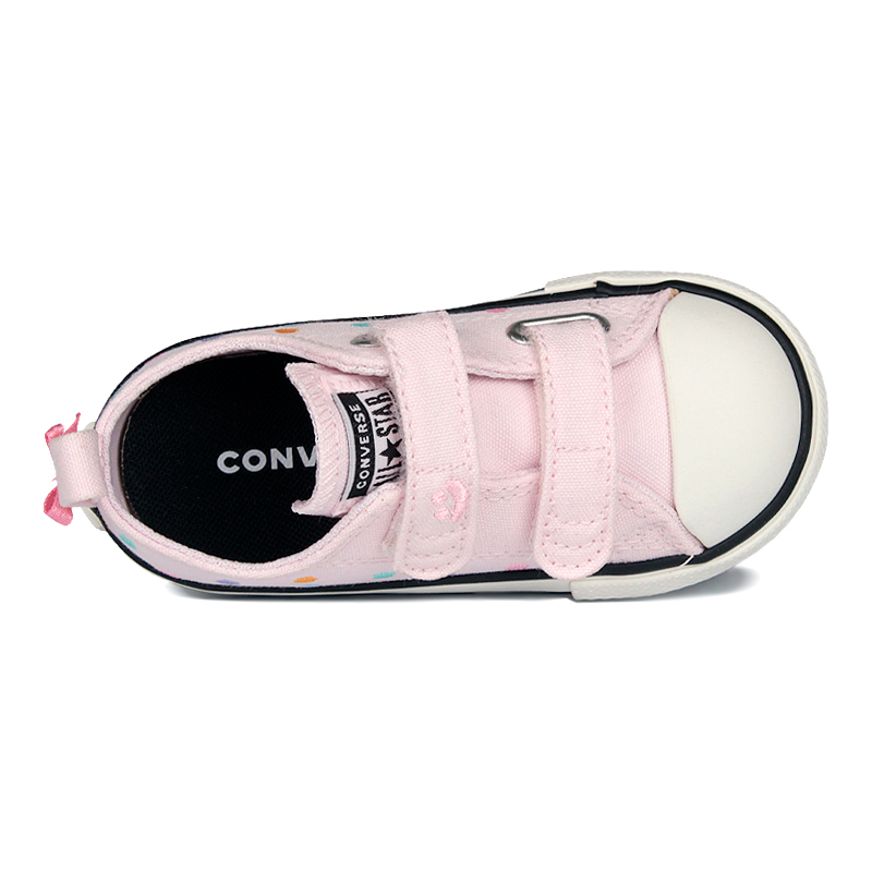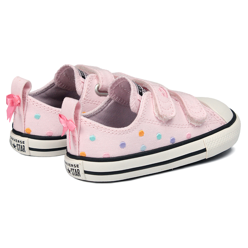 O Chuck Taylor Polka Dots Ox Frutas Silvestres é a versão kids de cano baixo com duas tiras de velcro da coleção Polka Dots. Ele traz o visual clássico dos Chucks em lona com bordados coloridos de bolinhas, inspirados no tema “Frutas Silvestres”, criando um tênis leve, divertido e cheio de detalhes para o dia a dia das crianças. O cabedal em algodão tipo lona conta com costuras reforçadas, forro interno macio e dois ilhoses laterais para ajudar na respirabilidade.O fechamento 2V com duas tiras de velcro facilita muito a rotina: o calce fica rápido, ajustável e prático até para os pequenos que já estão aprendendo a colocar o tênis sozinhos. A palmilha com amortecimento em EVA colabora com o conforto a cada passo, enquanto a vira em borracha e o solado vulcanizado garantem aderência e durabilidade, acompanhando brincadeiras, escola e passeios com segurança.