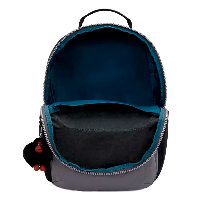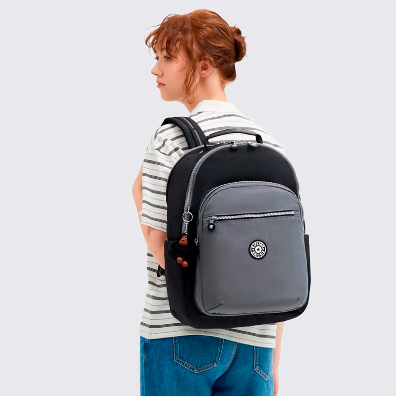 A Mochila Kipling Seoul College Extra Space Black BL I63502GX é a versão extra espaçosa da linha Seoul, pensada para quem precisa carregar muita coisa com organização. Com capacidade de 32 L e medidas aproximadas de 44 cm de altura, 35 cm de largura e 25 cm de profundidade, ela acomoda com folga livros, cadernos, estojo, pasta fina, casaco leve e acessórios do dia a dia. O compartimento principal conta com fechamento em zíper e espaço interno amplo, além de bolso aberto e passantes para canetas. Na parte de trás, um compartimento exclusivo e acolchoado para notebook comporta laptops de até 17", ajudando a manter o equipamento protegido e separado dos demais itens. A mochila ainda traz dois bolsos frontais com zíper para objetos menores e dois bolsos laterais com elástico, ideais para garrafas ou guarda-chuva. Para conforto durante o uso, a Seoul College Extra Space Black BL possui alças de ombro ajustáveis e acolchoadas, painel traseiro ergonômico e alça de mão reforçada na parte superior. O corpo em poliéster resistente com acabamento fosco na cor Space Black BL entrega um visual discreto e fácil de combinar, enquanto o chaveiro de macaco clássico da Kipling finaliza o modelo com a assinatura da marca.
