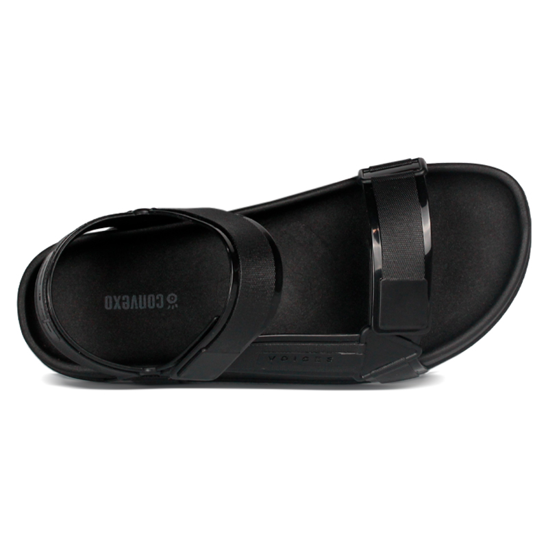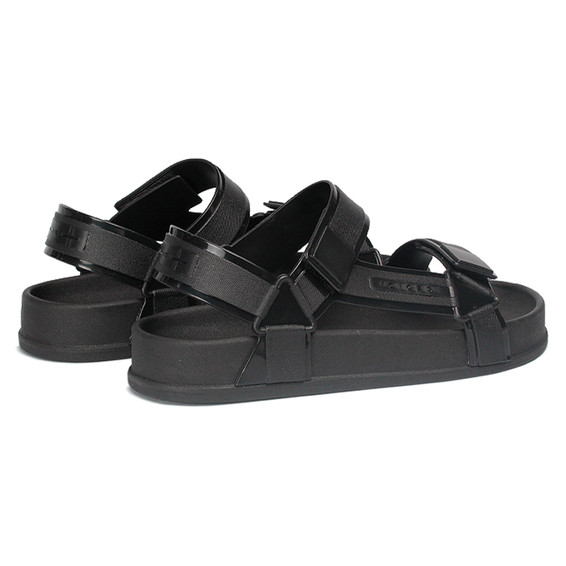 A Papete Preta mistura pegada utilitária com conforto diário. O cabedal traz straps ajustáveis em fita técnica com apliques em TPU e fecho autoaderente (estilo velcro) para ajuste rápido no peito do pé e no calcanhar. A palmilha anatômica em EVA apoia o arco e acomoda o pé; a base é leve e o solado com pods em relevo entrega tração estável no asfalto ou no piso liso.