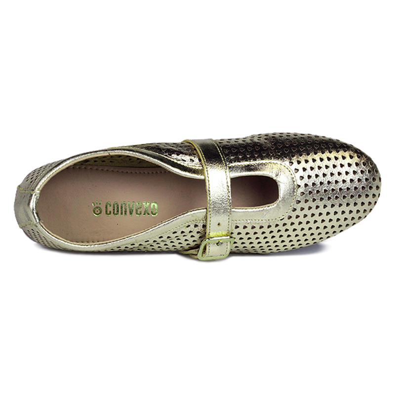 A Sapatilha Canoa Couro Metalizada Ouro Light Convexo pega a mesma base leve da nossa canoa clássica e traz um acabamento dourado cheio de presença. O cabedal em couro metalizado ouro light recebe vazados geométricos a laser por toda a superfície, ajudando na ventilação do pé e adicionando textura ao visual. A tira central com fivela metalizada ajustável garante encaixe firme no peito do pé, enquanto o recorte em “canoa” e o bico levemente arredondado acompanham o formato natural dos dedos. Por dentro, o modelo sem forro abraça o pé sem atrito e a palmilha levemente acolchoada ajuda a manter o conforto ao longo do dia. A sola emborrachada fina e flexível completa o conjunto com pisada estável, criando uma sapatilha baixa, fácil de usar, que combina brilho discreto, leveza e detalhe no acabamento.