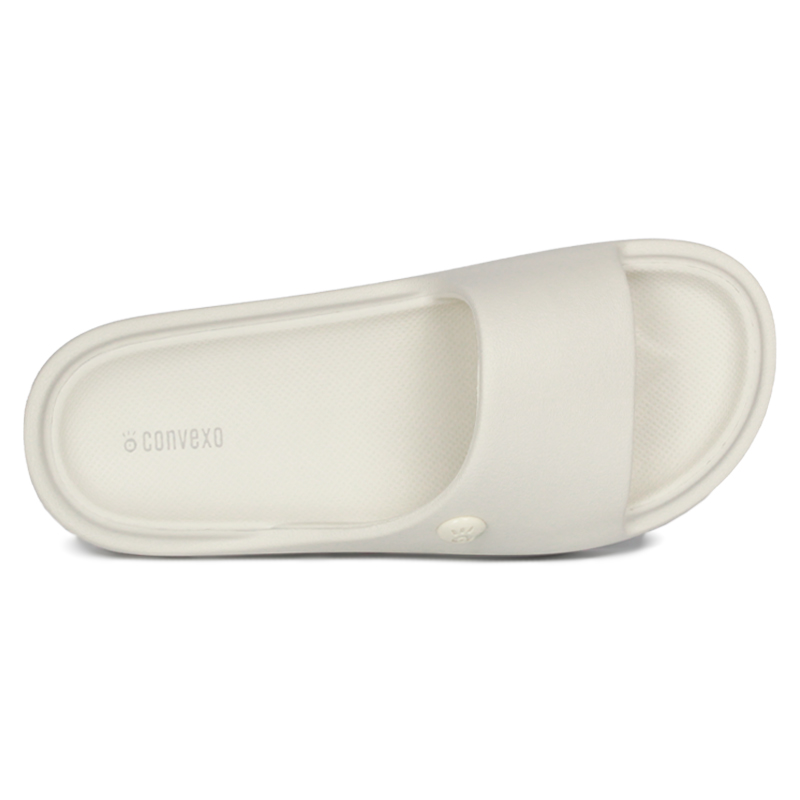 O Slide Mimo traz visual clean com conforto imediato: construção monobloco em EVA expandido (leve, flexível e fácil de limpar), tira larga com toque levemente fosco e palmilha texturizada com berço de calcanhar para segurar o pé. A base tem plataforma leve e solado antiderrapante com esferas em relevo para melhor tração.