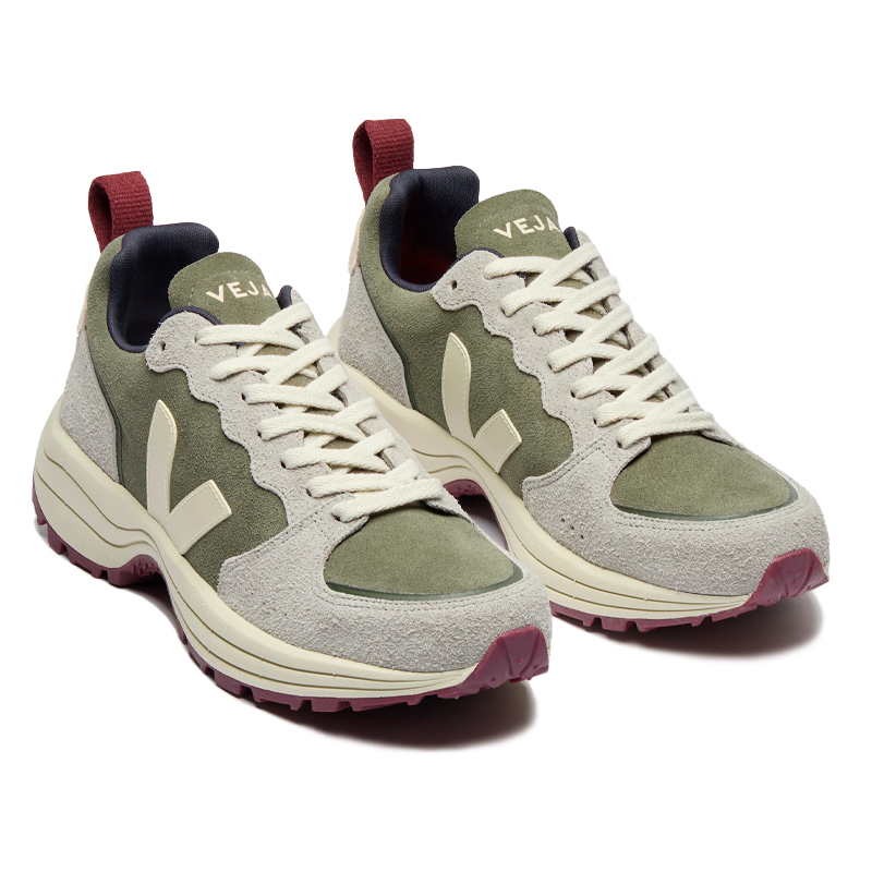 O tênis Veja Venturi II Suede Kaki Sable traz cabedal em camurça proveniente do Rio Grande do Sul, elegantemente tratado e revestido com óleos repelentes (livres de PFC), garantindo resistência à umidade leve sem perder o toque macio. A entressola é composta por bio-EVA (38%) derivada da cana-de-açúcar, promovendo amortecimento leve e responsivo. A sola combina borracha amazônica (31%), sílica mineral, borracha sintética e materiais reciclados, oferecendo equilíbrio entre tração e durabilidade. O forro é 100% poliéster reciclado e os cadarços e pull tab traseiro são em algodão orgânico, reforçando o caráter ecológico da peça. Produzido no Brasil.