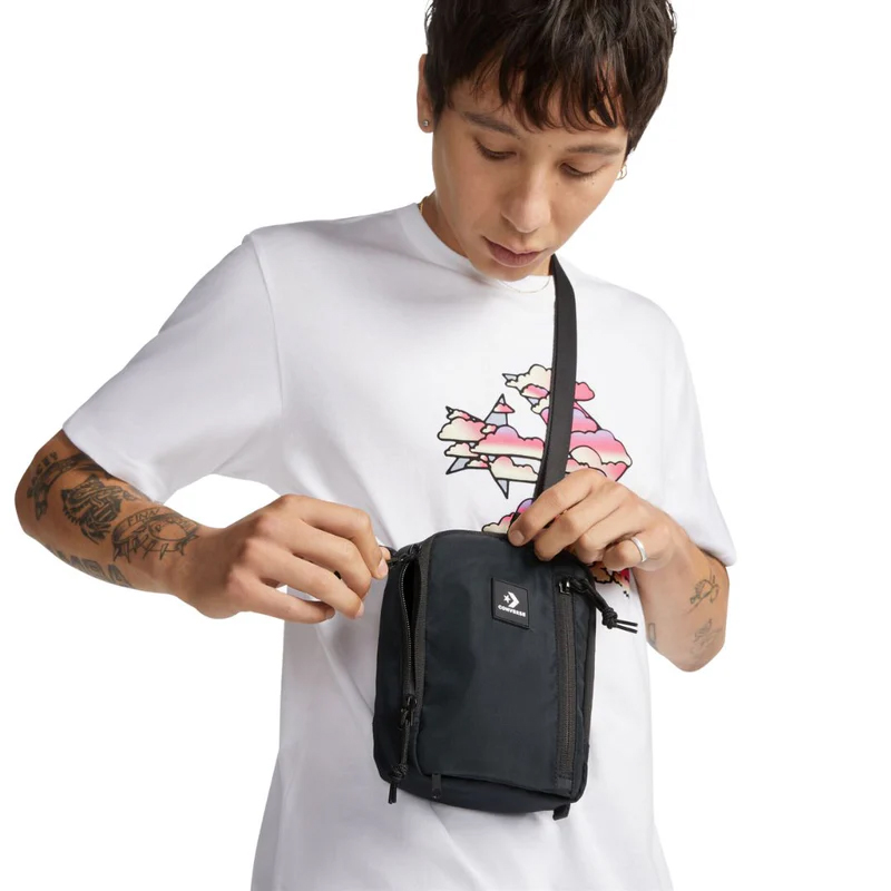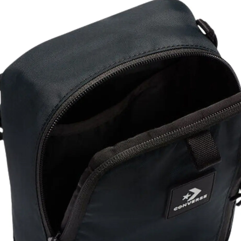A Bolsa Convertible Crossbody Converse Black é compacta e adaptável, ideal para transportar o essencial com estilo. Fabricada em poliéster resistente, conta com alça removível que permite uso tanto vertical quanto horizontal, além de bolso de malha externo que pode ser ocultado para um visual mais limpo. O selo Converse thumbpatch frontal reforça sua identidade clássica. DIMENSÕES APROXIMADAS: 18 cm A x 13 cm L
