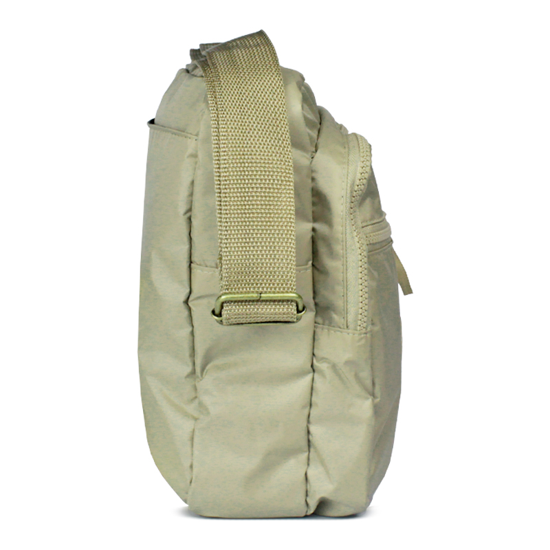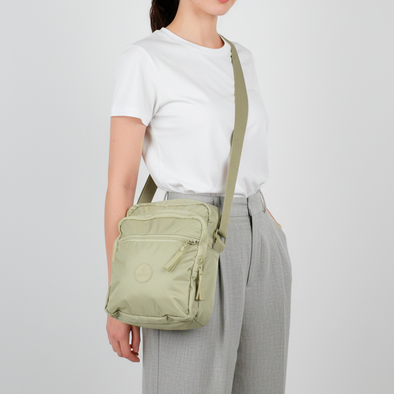 A Bolsa Kim II Areia confeccionada em poliéster resistente, possui alça regulável que garante conforto no uso, três bolsos frontais com fechamento em zíper e um bolso envelope na parte traseira para fácil organização. Com aproximadamente 26cm de altura por 21cm de largura, combina praticidade e estilo em um design leve e funcional para o dia a dia.