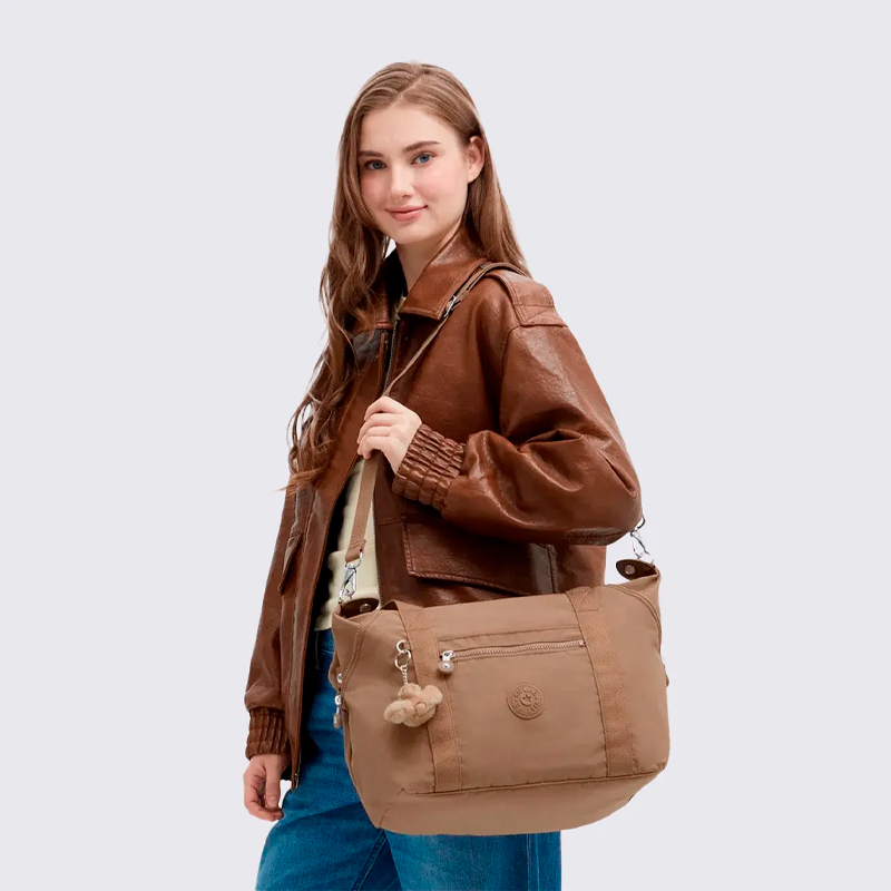 A Bolsa Kipling Art Early Tan é feita em nylon ultra leve e resistente, ideal para o uso diário. Possui compartimento principal com zíper, bolso frontal zipado e bolso externo aberto, além de alças duplas de mão e alça ajustável removível para uso crossbody ou de ombro. Conta com fechos de zíper e botões de pressão nos cantos que permitem ajustar levemente o formato da bolsa. Conta com chaveiro Kipling Monkey e logo circular da marca em destaque. DIMENSÕES APROXIMADAS: 44cm x 27cm x 20cm.