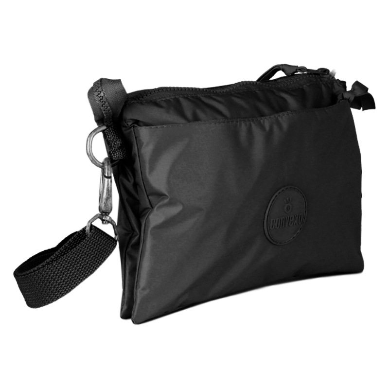 A Bolsa Rira é uma crossbody compacta (22,5 × 16 cm) feita em nylon poliéster: leve, resistente e fácil de limpar. Traz fechamento superior em zíper para o compartimento principal e bolso frontal com zíper para acesso rápido. A alça regulável permite ajustar a altura para uso no ombro ou transversal, com mosquetões metálicos para engate/remoção.
