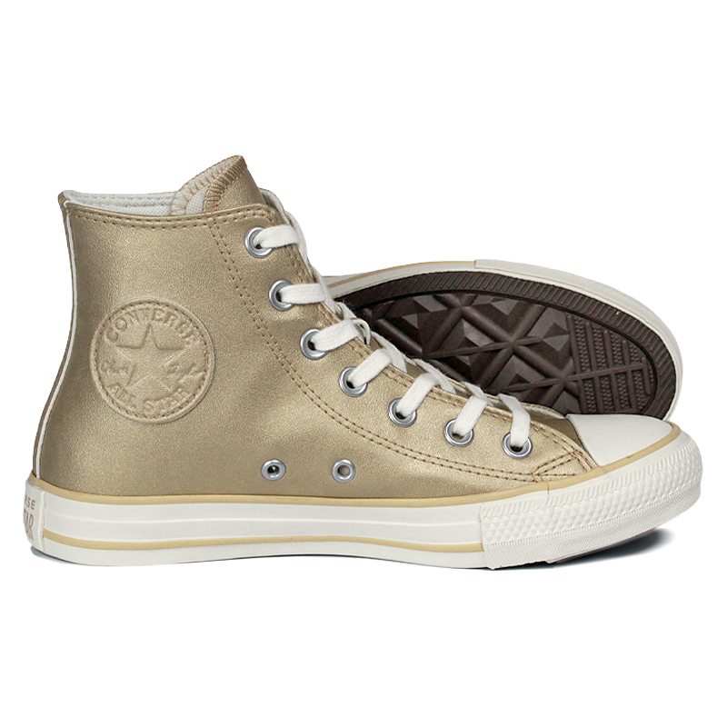 O Chuck Taylor All Star Hi Ouro Claro traz o clássico design de cano alto em uma versão moderna e sofisticada. Confeccionado em material sintético metalizado, o modelo combina estilo urbano com um toque de brilho, ideal para quem busca autenticidade e personalidade no visual. O tênis conta com cadarço de algodão que garante firmeza no ajuste e conforto no calce, além de solado emborrachado que oferece aderência e durabilidade para o dia a dia. O tradicional logo da marca aparece na lingueta e no calcanhar, reforçando a identidade icônica da Converse.