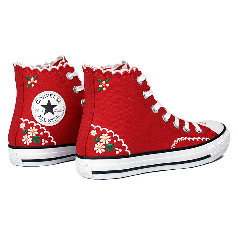 O Chuck Taylor All Star Hi Embroidery Graphic Vermelho transforma o clássico da Converse com um visual artesanal marcante. O cabedal em tecido de algodão recebe bordados florais que trazem textura e delicadeza ao design, sem abrir mão da estrutura icônica da silhueta original. O forro em poliéster proporciona conforto prolongado, enquanto o logo lateral em material sintético com acabamento gravado reforça a identidade da marca. O cadarço em algodão complementa o modelo com ajuste firme e toque suave.