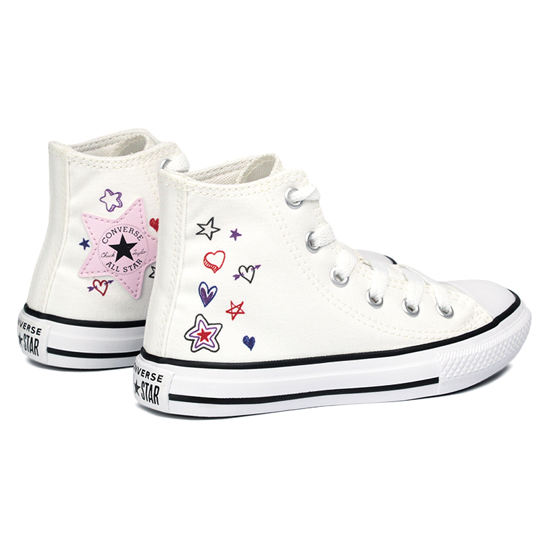 O Chuck Taylor All Star Kids Hi Essentials Branco apresenta estampa exclusiva de estrelas em estilo artesanal, logo lateral em formato de estrela e forro com espaço para adicionar o nome. O modelo conta ainda com cadarço de poliéster, que garante ajuste prático e resistente, mantendo o visual clássico da Converse em uma versão pensada para os pequenos.