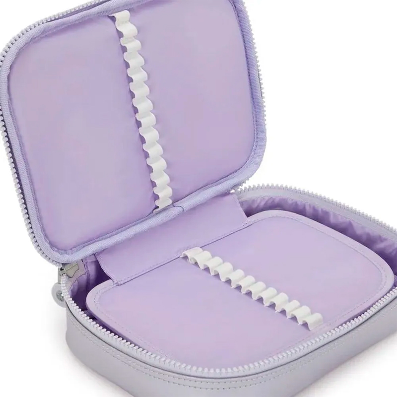 O Estojo Kipling 100 Pens Lilac M Met Bts um estojo estruturado e espaçoso, com uma divisória central que possui elástico para acomodar lápis e canetas. O modelo é ideal para o dia a dia escolar ou até mesmo para guardar maquiagem