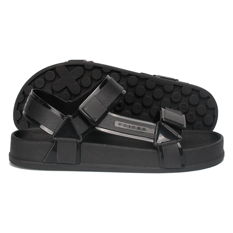 A Papete Preta mistura pegada utilitária com conforto diário. O cabedal traz straps ajustáveis em fita técnica com apliques em TPU e fecho autoaderente (estilo velcro) para ajuste rápido no peito do pé e no calcanhar. A palmilha anatômica em EVA apoia o arco e acomoda o pé; a base é leve e o solado com pods em relevo entrega tração estável no asfalto ou no piso liso.