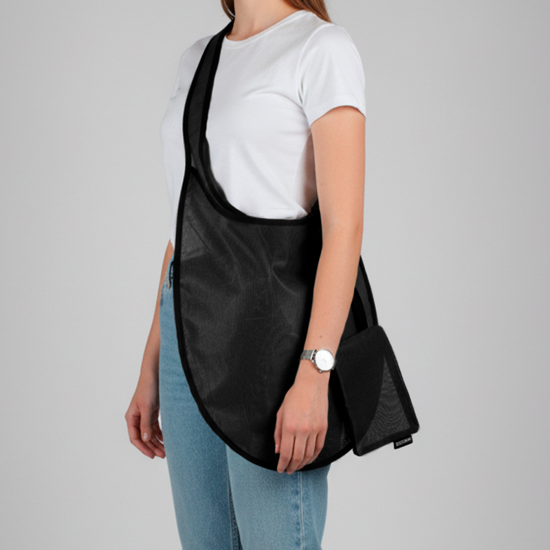 O Saco Tela Meia Lua Preto é um modelo hobo em poliéster estilo tela, leve e maleável. Possui fechamento por botão magnético e acompanha pouch/necessaire removível preso por mosquetão. Estrutura ampla para volume sem rigidez e caimento plano quando vazia. TAMANHO APROXIMADO: Bolsa 40 cm (A) × 44 cm (L) — Pouch 18 cm (L) × 13,5 cm (A).