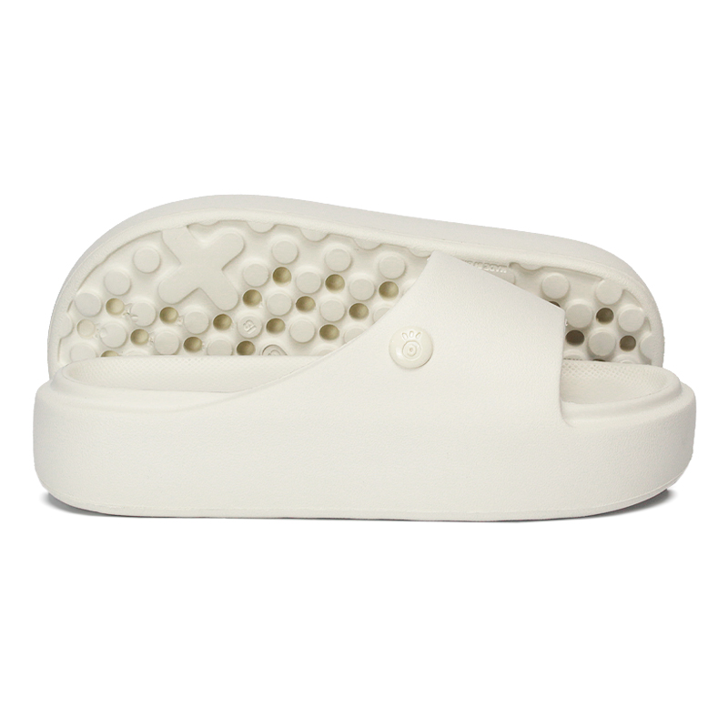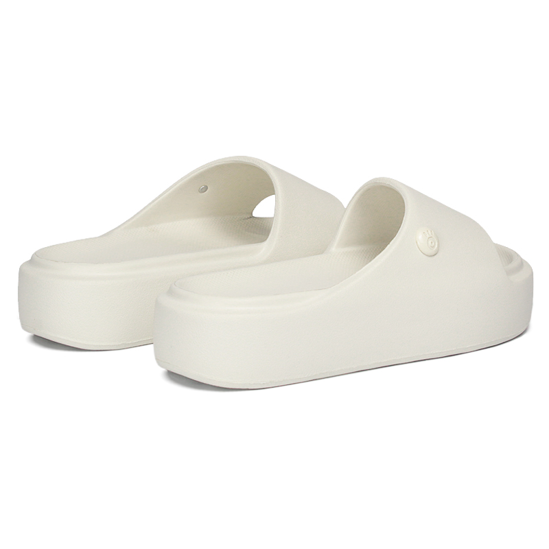 O Slide Mimo traz visual clean com conforto imediato: construção monobloco em EVA expandido (leve, flexível e fácil de limpar), tira larga com toque levemente fosco e palmilha texturizada com berço de calcanhar para segurar o pé. A base tem plataforma leve e solado antiderrapante com esferas em relevo para melhor tração.