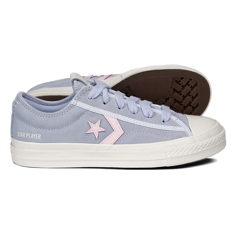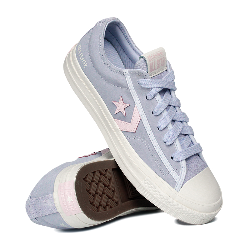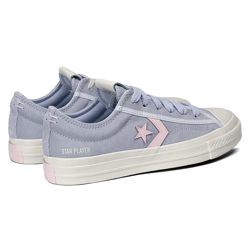 O Star Player 76 Colorful Suede Blueberry Ice/Sugar Berry combina tons suaves e acabamento em camurça para um visual descontraído com presença. A base em azul lavanda recebe detalhes em rosa claro no icônico Star Chevron, criando contraste sutil e marcante. O cabedal é construído em camurça, com sobreposições e costuras reforçadas que mantêm a estrutura firme. A palmilha OrthoLite proporciona leve amortecimento e suporte para o uso diário, enquanto o solado de borracha garante tração e durabilidade. Um tênis que atualiza a linha Star Player com uma paleta moderna e acabamento premium, mantendo o DNA clássico da Converse.