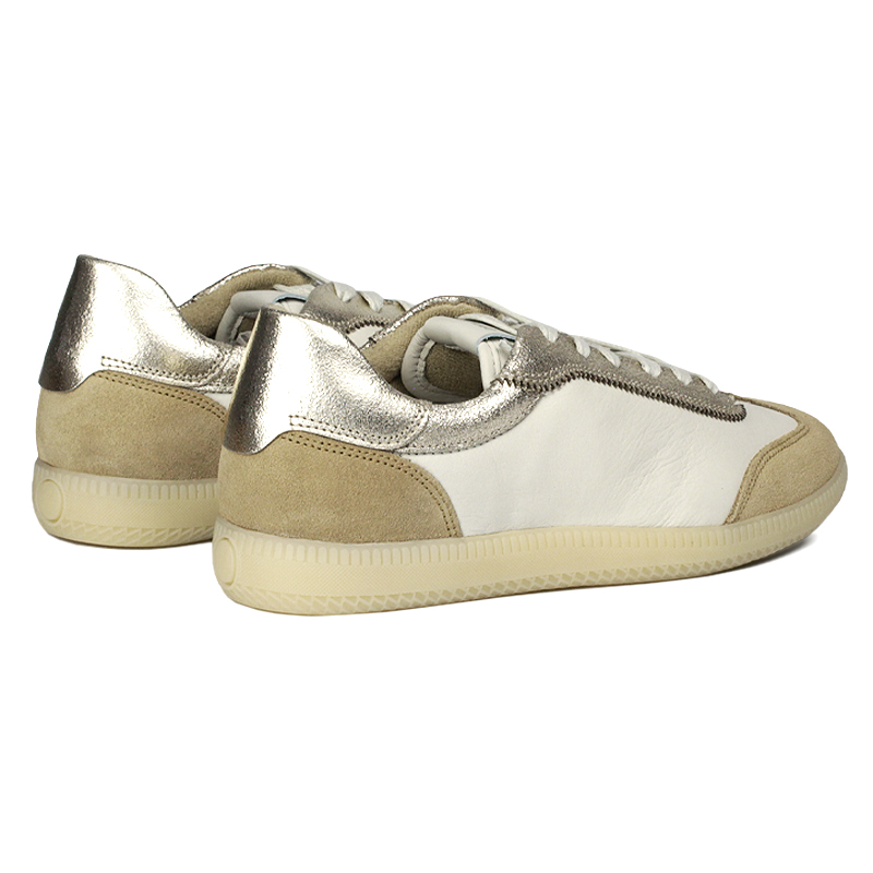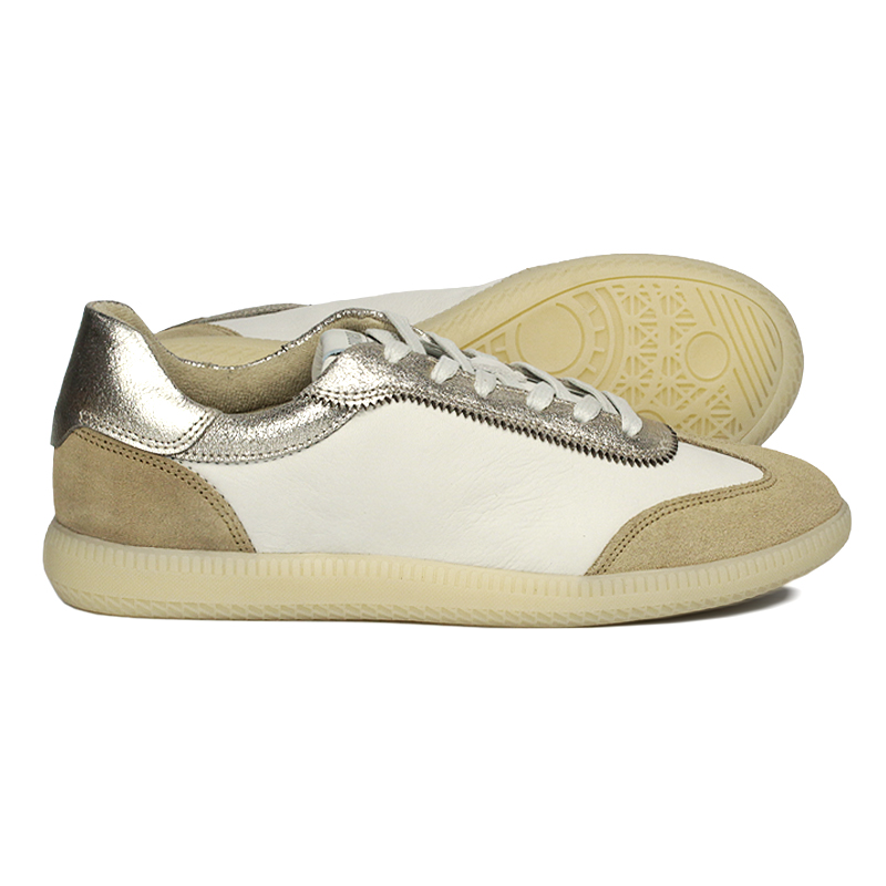 O Tênis Debbie Soccer Neve/Avelã mistura elementos clássicos com detalhes metalizados que elevam o visual esportivo a um novo patamar. Com cabedal em couro branco e painéis em camurça bege, o modelo ganha destaque com o acabamento prateado nas áreas superiores e no calcanhar, criando um contraste elegante e contemporâneo. A construção robusta em materiais premium garante durabilidade, enquanto a sola em borracha gum oferece tração e leveza no uso diário. O cadarço branco e a costura decorativa ao redor do metalizado completam o design com personalidade.