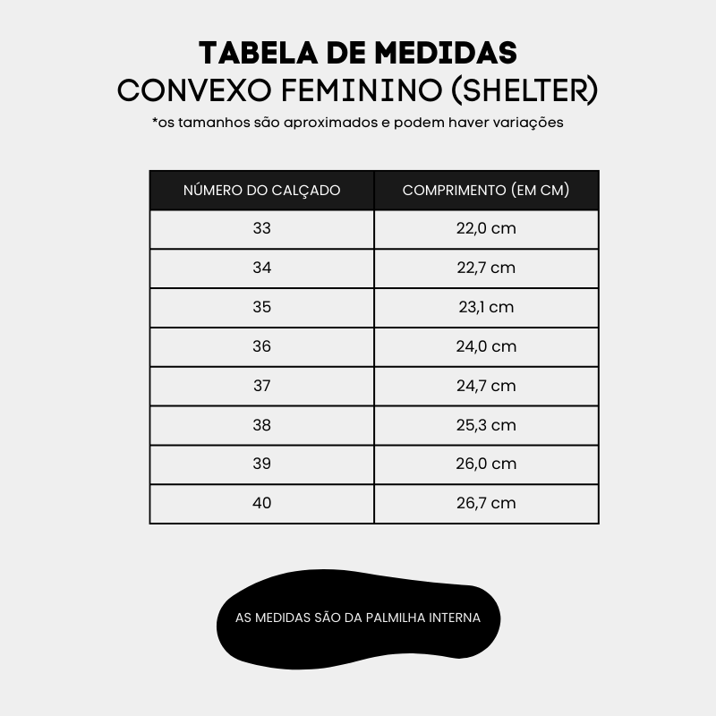 | Tamanho | 34, 35, 36, 37, 38, 39 |