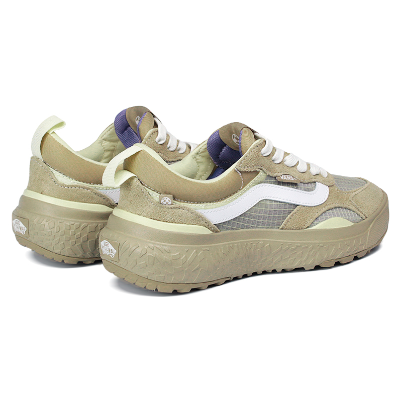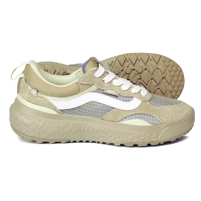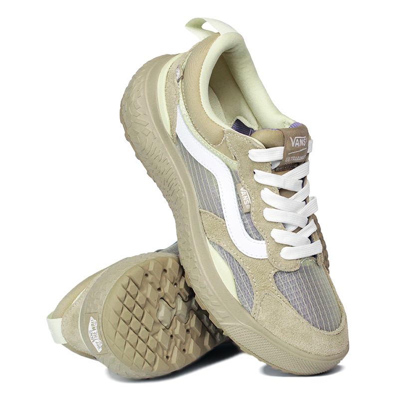 O Vans MTE UltraRange Neo VR3 Translucent Ripstop Dark Brown/White combina inovação técnica com materiais de menor impacto ambiental. O cabedal em ripstop translúcido, resistente e leve, possui painéis estruturais e detalhes costurados para reforço nas áreas de maior atrito. A entressola utiliza espuma VR3Cush™, formulada com pelo menos 50% de EVA de base biológica derivado de fontes renováveis. O solado VR3Waffle™, feito com borracha natural regenerativa, mantém a tração e a durabilidade características da marca, com foco em reduzir impactos ambientais. A construção interna conta com suporte metatarsal moldado para maior estabilidade e palmilha perfurada para facilitar a respirabilidade. O sistema de amarração rápida com cordões elásticos e o contraforte reforçado garantem ajuste seguro ao pé. Etiquetas e detalhes no calcanhar finalizam o design com identidade MTE.