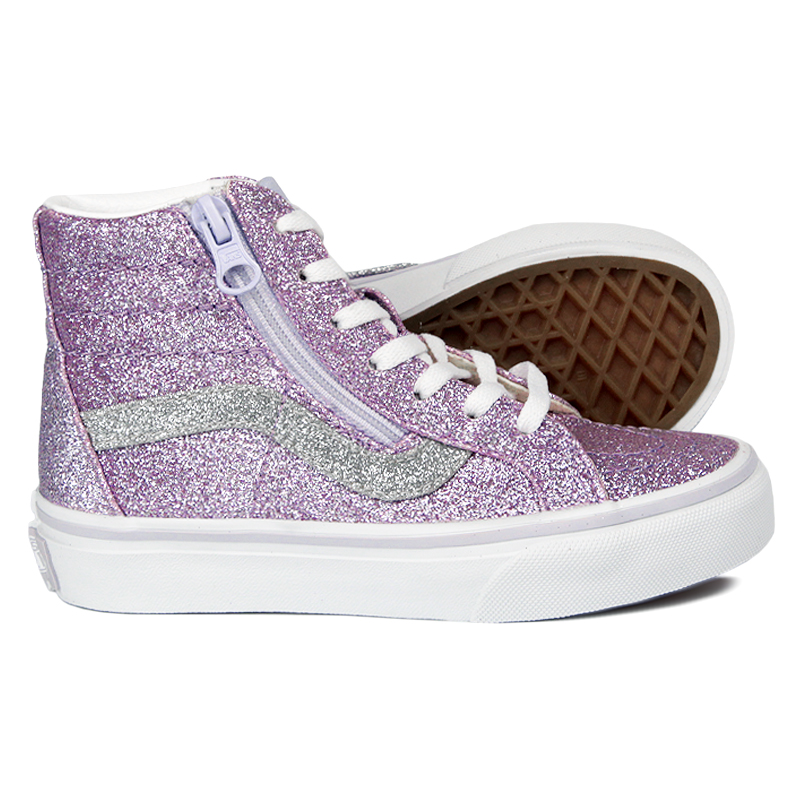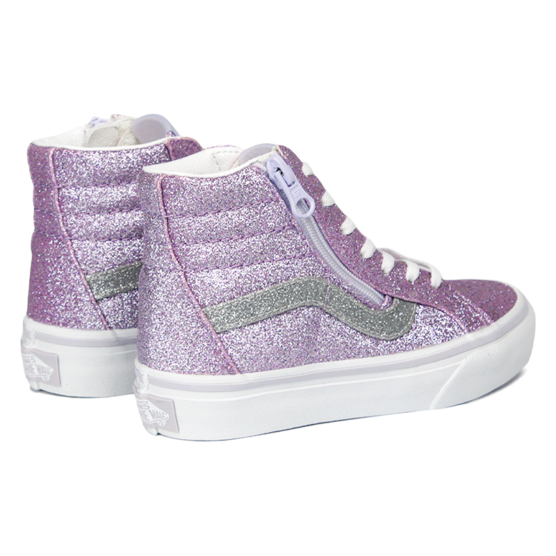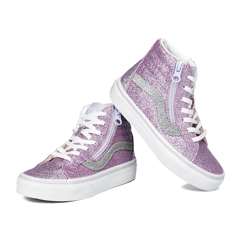 O Vans Sk8-Hi Kids Reissue Side Zip Lilás traz a clássica silhueta de cano alto da marca em uma versão cheia de estilo e praticidade para o dia a dia das crianças. Com acabamento moderno em glitter lilás e a icônica Sidestripe em contraste, o modelo combina autenticidade e diversão em cada detalhe. O fechamento por zíper lateral facilita o calce, garantindo mais autonomia e conforto, enquanto o design inspirado no estilo vintage mantém o DNA atemporal da Vans.