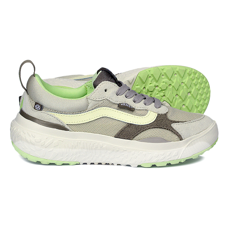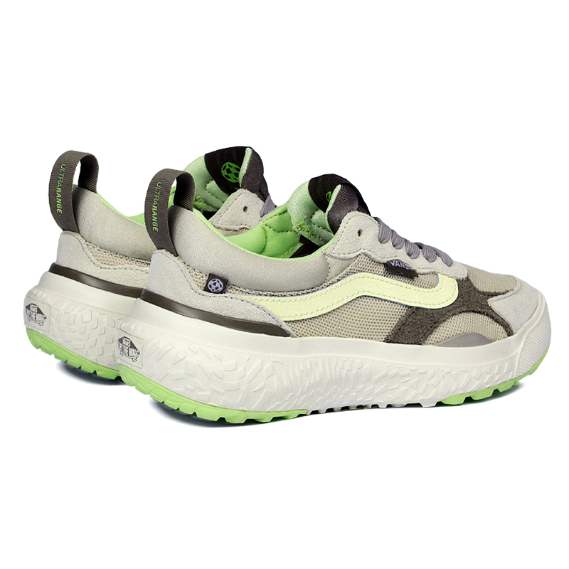 O Vans UltraRange Natural/Multi foi repensado para oferecer um design inovador com foco em materiais mais sustentáveis. Cada detalhe desse modelo foi reconstruído para reduzir impactos ambientais sem abrir mão do desempenho e conforto. A entressola EcoCush™ utiliza espuma composta por 50% de materiais de origem biológica, enquanto a sola Ecorubber™ é feita com borracha de fontes renováveis. O cabedal respirável em knit combina 50% de algodão orgânico, 34% de RPET, 14% de nylon reciclado e 2% de spandex, minimizando desperdícios em comparação com os métodos tradicionais de corte e costura. Seguindo as metas sustentáveis da Vans, o UltraRange VR3 faz parte de uma iniciativa que busca impacto positivo na indústria. Para exibir o selo VR3 Checkerboard Globe, ao menos 30% de sua composição vem de materiais reciclados, renováveis ou regenerativos.