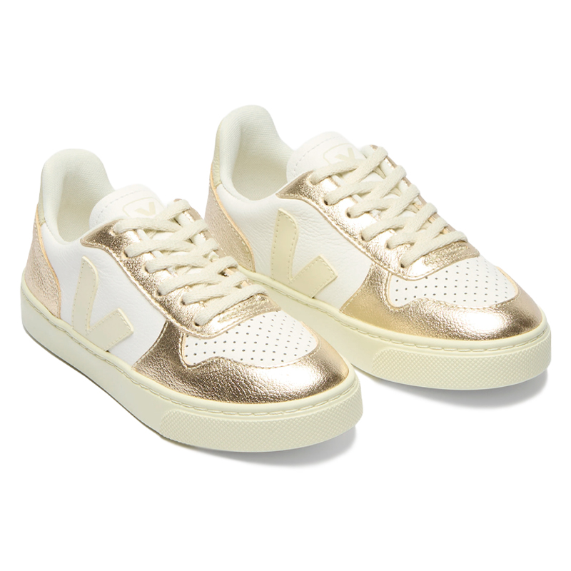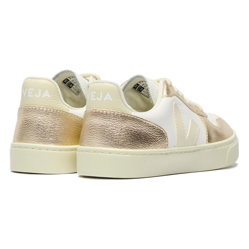 O tênis Veja Small V-10 Laces Leather White Calcaire Platine Junior mescla elegância e responsabilidade ambiental em um modelo infantil premium. O cabedal em couro Organic Traced (O.T.) com acabamento branco e detalhes platinados oferece visual refinado e resistente. A palmilha combina bio-EVA e algodão orgânico para amortecimento leve e respirável, enquanto a entressola em bio-EVA garante leveza e desempenho. A sola é feita com borracha amazônica, sílica mineral e borracha reciclada, proporcionando aderência durável e respeitando princípios sustentáveis. O interior traz forro em poliéster reciclado e os cadarços são confeccionados em algodão orgânico. Fabricado no Brasil.