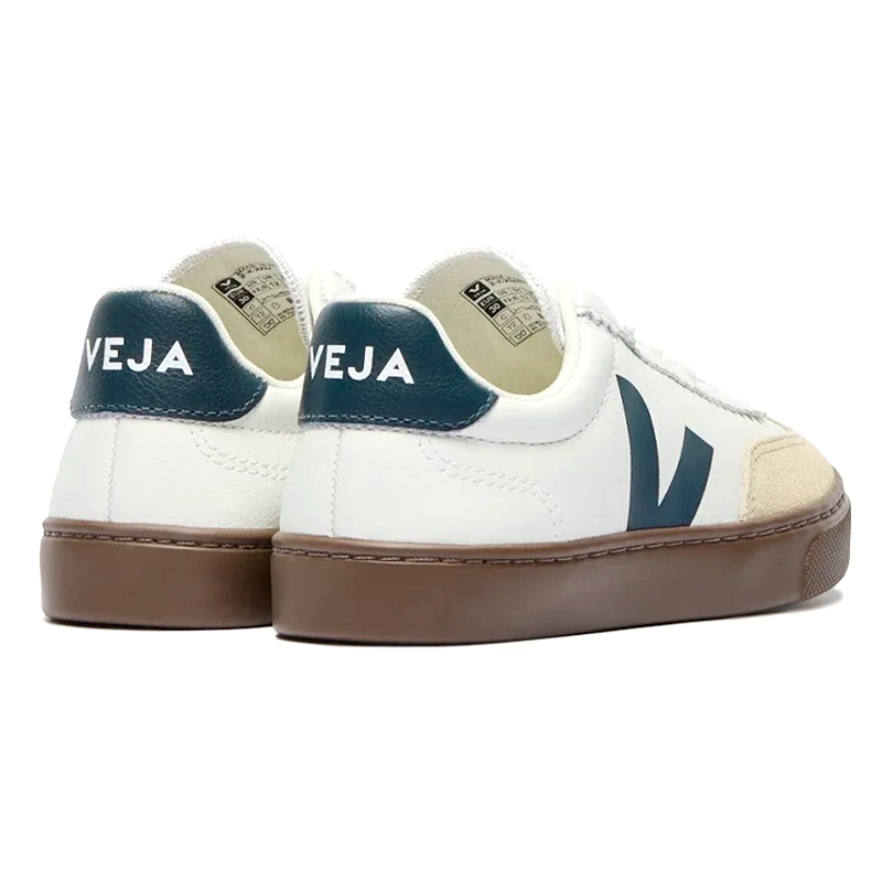 O tênis Veja Small Volley O.T. Leather White Náutico Bark Junior combina o design esportivo retrô com construção responsável. Seu cabedal é em couro Organic Traced (O.T.), com painéis em camurça que reforçam estrutura e contraste. A palmilha mistura bio-EVA (mais de 60 %), algodão orgânico e borracha amazônica para amortecimento leve e respirável. A sola une borracha amazônica, sílica mineral e componentes reciclados, garantindo tração e durabilidade. Forro em poliéster reciclado e cadarços elásticos (sem necessidade de amarrar) facilitam o uso para crianças. Produzido no Brasil.