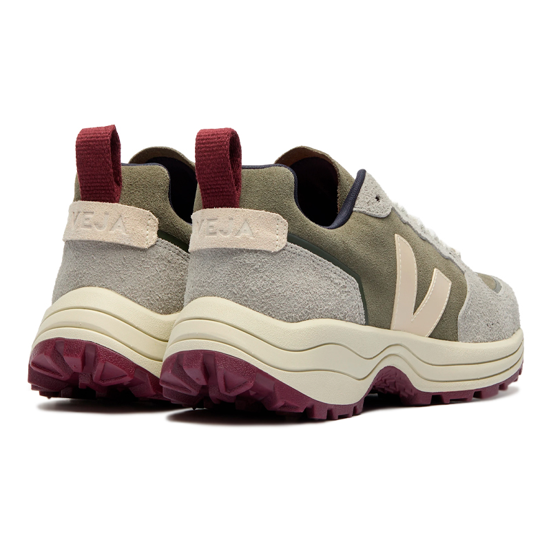 O tênis Veja Venturi II Suede Kaki Sable traz cabedal em camurça proveniente do Rio Grande do Sul, elegantemente tratado e revestido com óleos repelentes (livres de PFC), garantindo resistência à umidade leve sem perder o toque macio. A entressola é composta por bio-EVA (38%) derivada da cana-de-açúcar, promovendo amortecimento leve e responsivo. A sola combina borracha amazônica (31%), sílica mineral, borracha sintética e materiais reciclados, oferecendo equilíbrio entre tração e durabilidade. O forro é 100% poliéster reciclado e os cadarços e pull tab traseiro são em algodão orgânico, reforçando o caráter ecológico da peça. Produzido no Brasil.